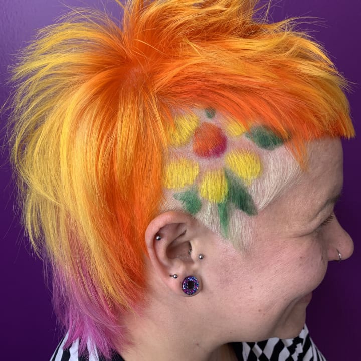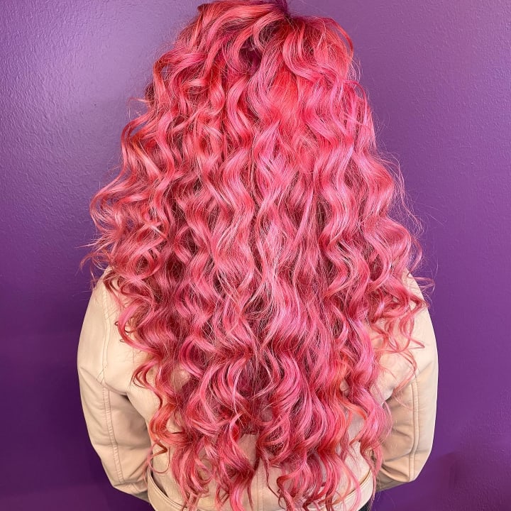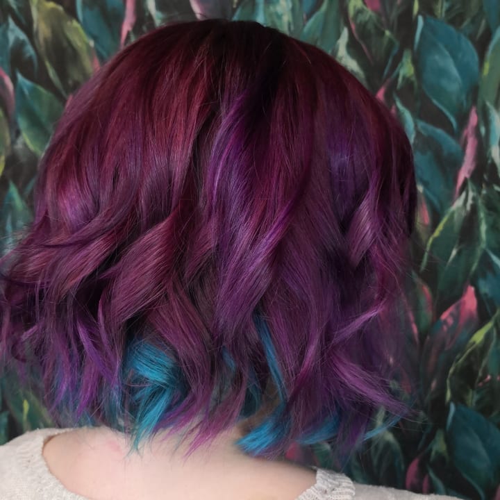 Monivärivärjäys, hiukset lapaluiden alapuolella. Sisältää pesun.